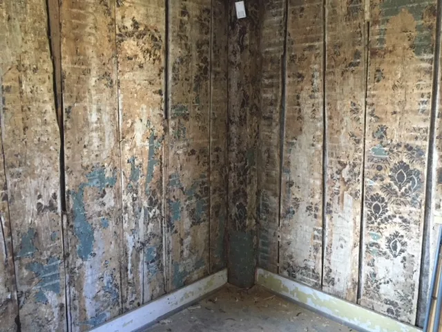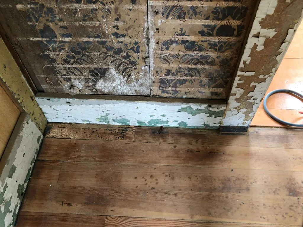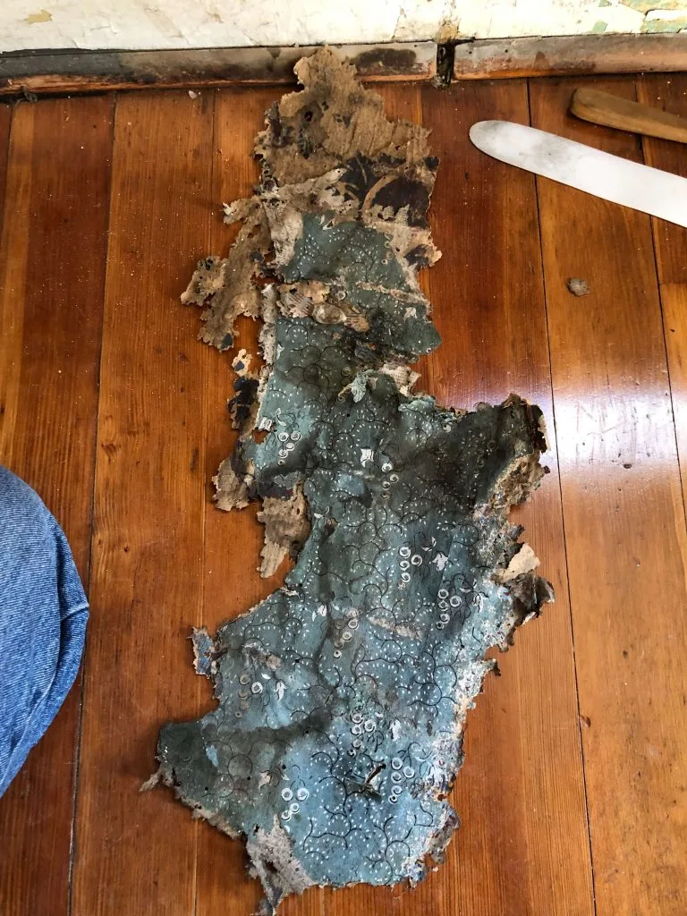 “Two distinct layers of wallpaper adhered directly to wide plank interior and exterior walls have been recently revealed [August 2017] following the removal of wall paneling [2005] and the plaster & lath covering. The wallpaper remains in fragmented sections and a printed text interlayer is visible where the uppermost wallpaper is missing. The fragmentary sections of wallpaper appear damaged from prolonged exposure to moisture, rom the application an subsequent removal of covering layers and from extensive damage from silverfish feeding on the cellulose and starch of wallpaper.”