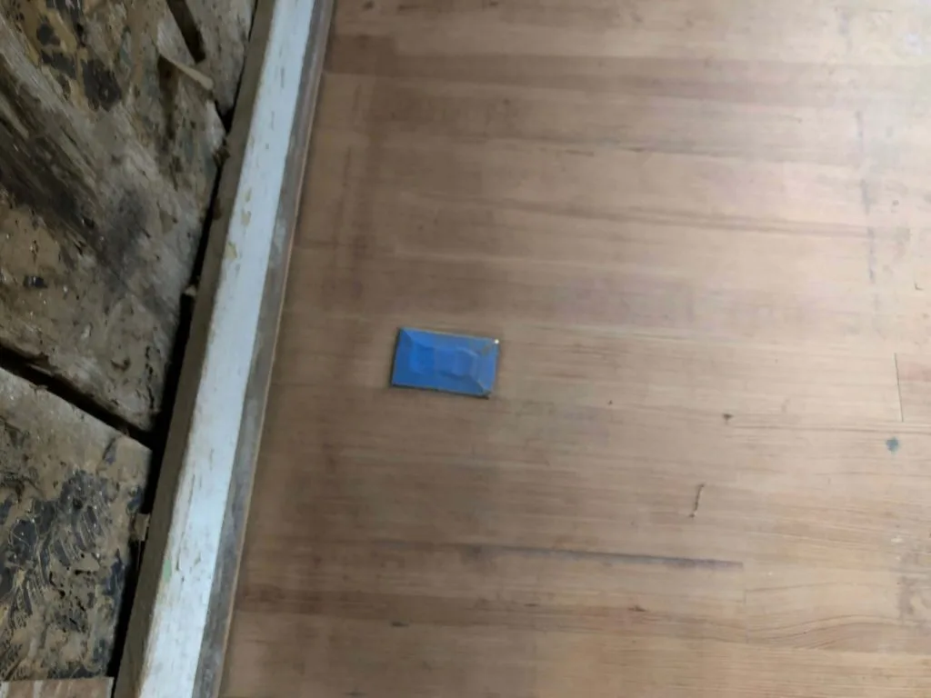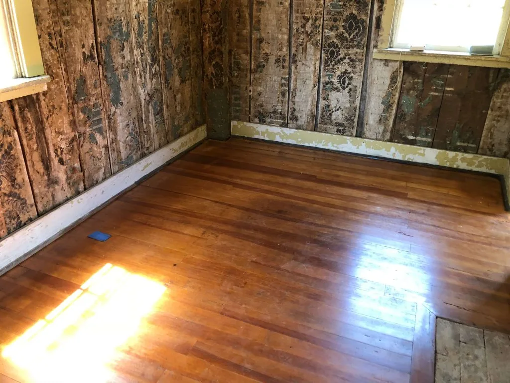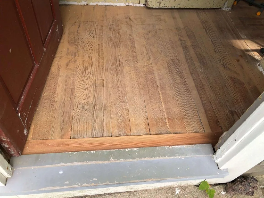 Our contractor, Thomas J. Figueiredo, addressed all the floors including the sitting room and foyer. The wood species believed be a yellow pine used for floors in the late 19th century was in good condition. These were sanded and finished with a poly oil-base intended to withstand foot traffic. The minor repair at the threshold was made using a sample of the same wood species found in the house.