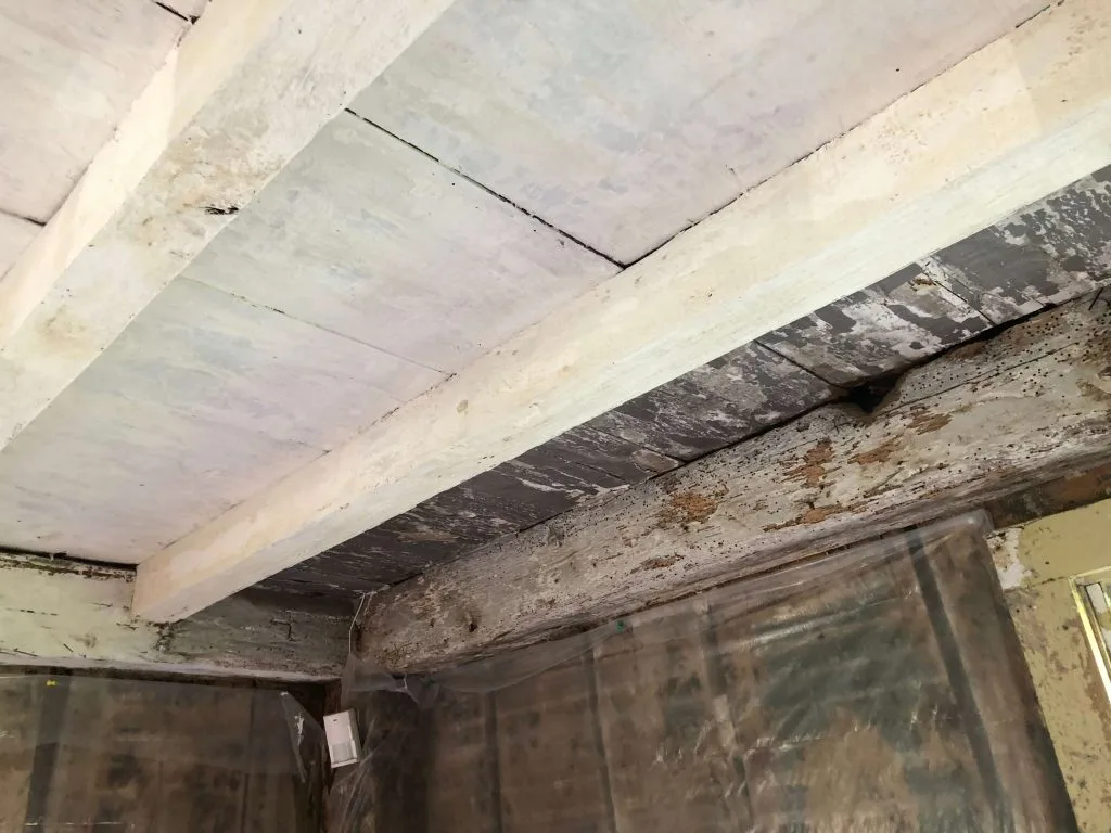 The ceiling required attention and became the second stage of preservation work in the sitting room. Chris Shelton initially examined the ceiling and tested for its composition. According to Chris’s report, “It is comprised of layers of chalk and no binder. This is traditional lime-wash or white-wash where a wet coating of slaked lime is applied and allowed to dry and revert to calcium carbonate. It forms a low-sheen finish common in architectural settings where surfaces are not heavily worn. There are at least 12 applications visible in the sample testes. … Micro chemical testing for the presence of lead in the sample was negative.”